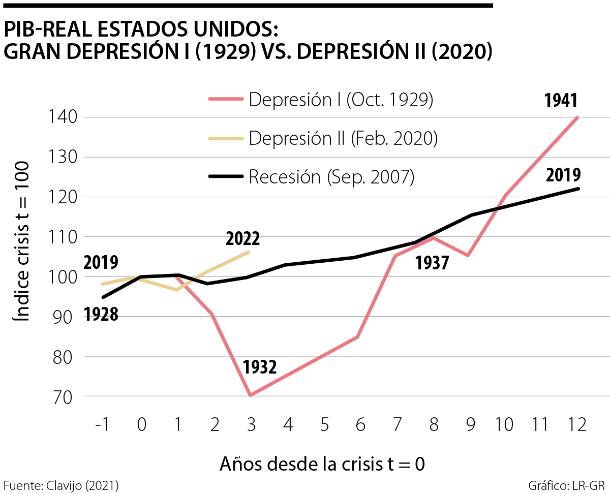 El gráfico adjunto ilustra cómo, durante la Gran Depresión I, el PIB-real de los Estados Unidos se había contraído en casi 30% a la altura del tercer año de la crisis (en 1932) y le tomaría otros cinco años para llegar a superar el nivel que se tuvo al momento de la crisis (en 1929). Paradójicamente, cuando creían haber superado semejante choque, su PIB-real volvió a contraerse en 1938, pero se recuperaría con el fin de la segunda guerra mundial 1940-1941, al cerrar con un +40% real por encima del nivel de 1929.