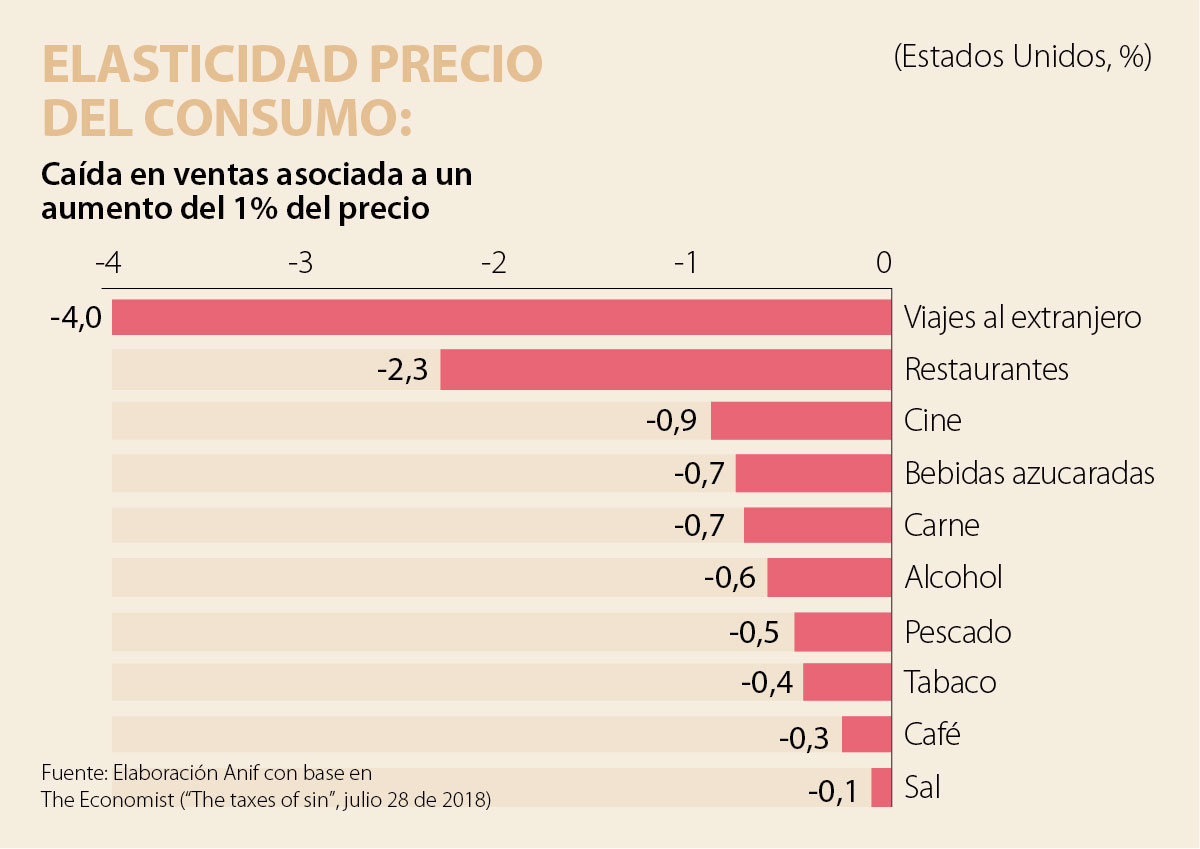 Por ejemplo, se estima que la elasticidad precio del consumo de tabaco y del alcohol es tan alta como 0,5% (ver The Economist, “The taxes of sin”, julio 28 de 2018), ver gráfico adjunto. De allí que resulte algo de Perogrullo cuando los productores de estos bienes argumentan que “el problema” de elevar el precio final de estos vicios a través de sobre-tasas es que se reduce el consumo: claro, de eso se trata y eso se logra con dichos impuestos a los vicios, lo cual se resume en esa elevada elasticidad-precio.