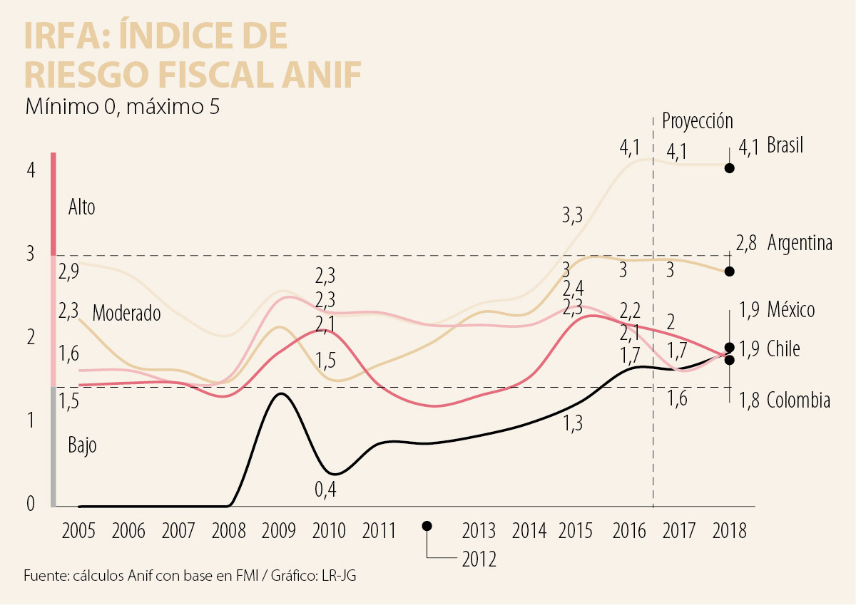 Durante 2015-2016, el mayor nivel de riesgo fiscal entre los países grandes de la región lo registra Brasil, promediando un Irfa de 3,7 frente a un máximo de 5 (ver gráfico adjunto). Las contracciones de su PIB-real a tasas cercanas a -4% anual lo han llevado a registrar déficits fiscales cercanos a 10% del PIB durante ese período 2015-2016.