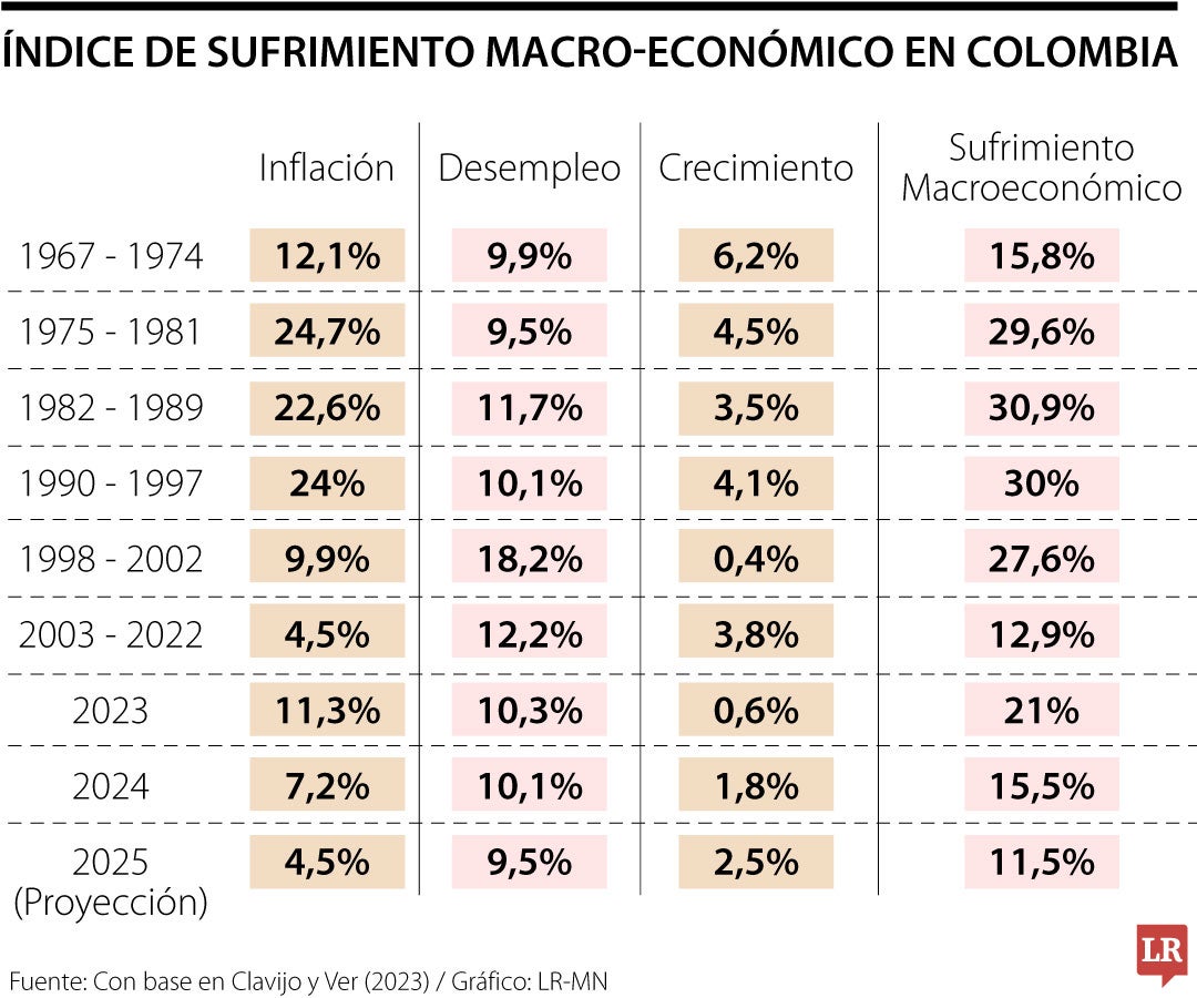 Una forma sencilla de obtener un balance sobre el desempeño macroeconómico es a través de computar lo que hemos denominado el índice de sufrimiento macroeconómico (Clavijo y Vera, 2023 “Banca Central…”), definido como: (inflación + desempleo) - (crecimiento económico). Esta es una variante del índice de empobrecimiento-miseria de Okun, donde solo entraban los dos primeros componentes.
