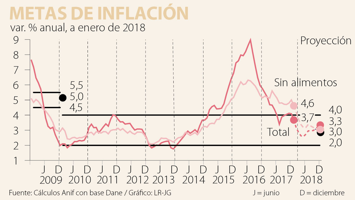 Anif pronostica que la inflación total continuará convergiendo hacia valores de 3,3% anual al cierre de 2018 (debido a la disipación del choque del incremento del IVA del 2017 y a la postración de la demanda agregada).