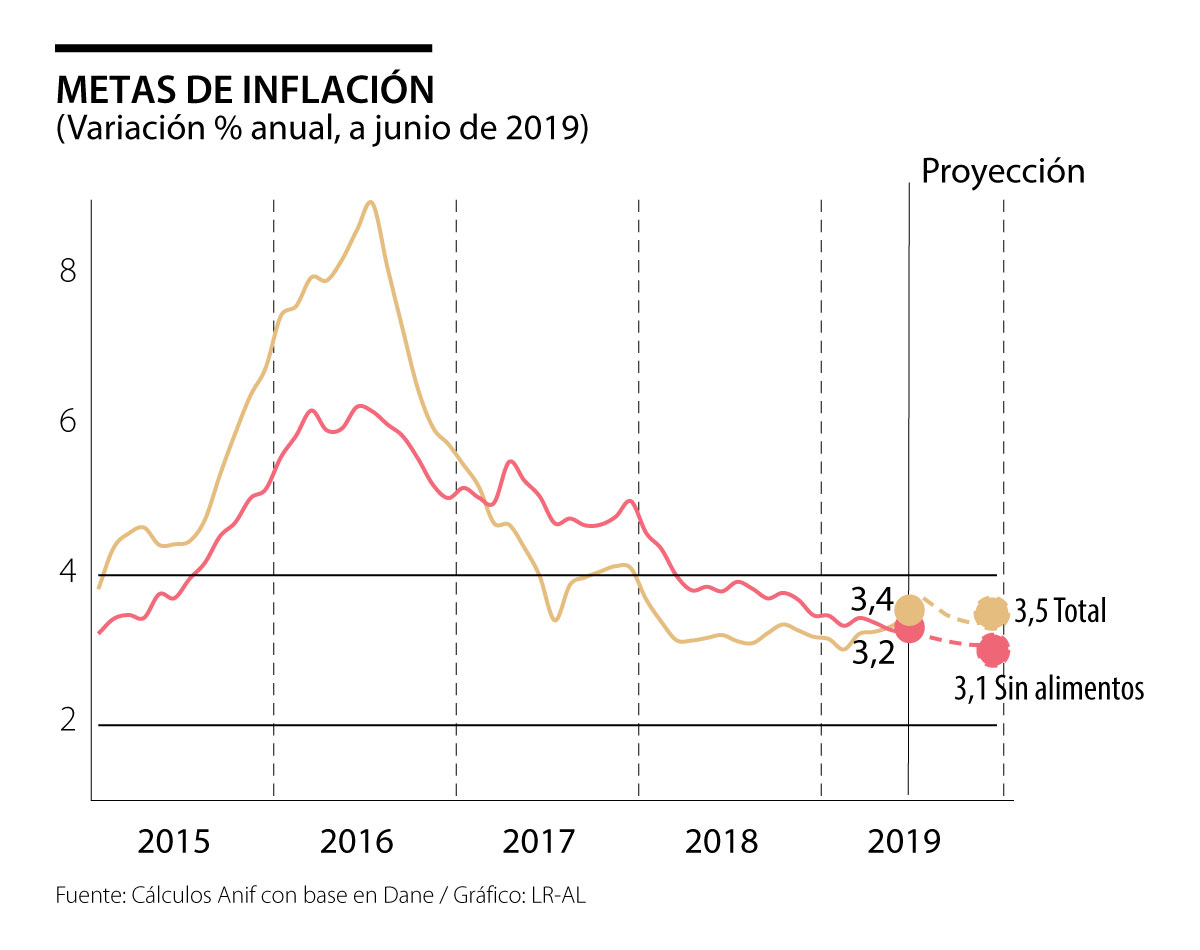 Anif ha venido mencionando que buena parte de esa contención inflacionaria de costos obedece a la debilidad de la demanda agregada, tal como lo vienen sugiriendo los indicadores líderes. Por ejemplo, la producción manufacturera se desaceleró hacia el 1,9% anual en enero-abril de 2019 (vs. 2,7% un año atrás), mientras que el comercio minorista lo hizo al 5,5% (vs. 6,2%). Además, el ISE del Dane tan solo mostró expansiones del 2,1% anual en abril (vs. 3,6% un año atrás), con lo cual difícilmente se alcanzarán crecimientos del 3,5% en el segundo semestre de 2019 (ver ALI No. 142 de junio de 2019). A estas debilidades sectoriales debe añadírsele el negativo efecto que está teniendo sobre la demanda agregada el marcado deterioro laboral, con tasas de desempleo que han venido promediando un 11,3% en enero-mayo (+1pp frente al mismo período del año anterior).
