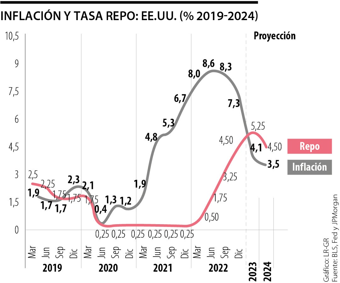 Así, lo más probable es que la FED se mueva a reducir su repo hacia 4% a inicios de 2024, tras haber logrado un aceptable crecimiento de 1% en el PIB-real de los Estados Unidos en 2023.