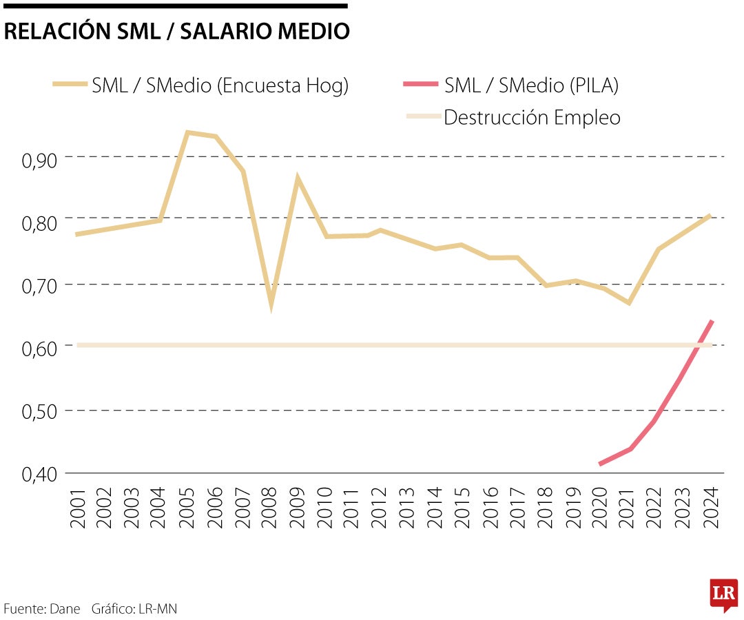 Como es sabido, el encarecimiento laboral de la contratación formal acarrea incrementos en la informalidad laboral y debilitamiento fiscal en la seguridad social en salud y pensiones. Esto ocurre especialmente cuando el Estado desborda la Salario Mínimo Legal (SML) respecto de la productividad, ya que este afecta a 60% del mercado laboral formal de Colombia.