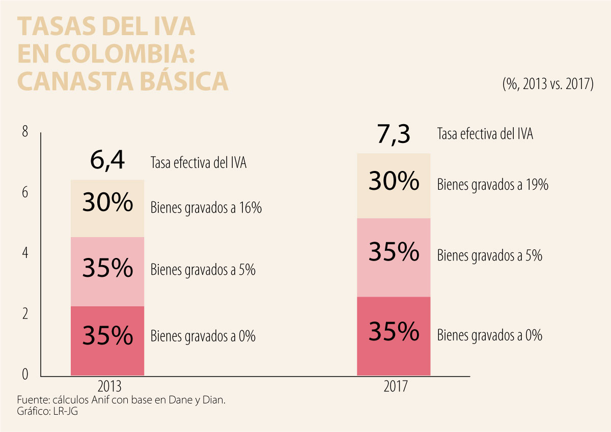 Con respecto a la canasta de consumo básico de los hogares en Colombia (definida por el Dane), la aplicación de dicha Ley 1819 de 2016 implicó que cerca de 30% de esos bienes básicos se viera afectado al subir la tasa general del IVA de 16% hacia 19%. No obstante, ese mayor costo se vio compensando con el hecho de haber mantenido cerca de 35% de esa canasta básica con tratamiento preferencial en tasas del IVA a 5%.