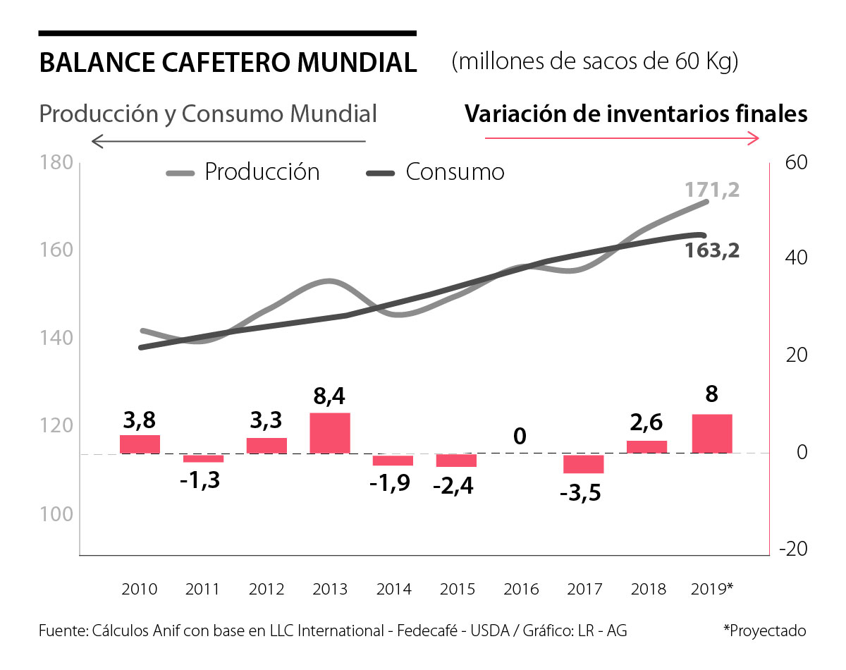 Ante esta situación, se han escuchado pronunciamientos algo desatinados de la dirigencia cafetera de Colombia de “romper el termómetro para bajar la fiebre”, amenazando con retirar la oferta del café colombiano del conocido “mercado C de New York”. Con esa actitud se da a entender que el precio spot allí ha bajado por cuenta de “maniobras especulativas”, en vez de analizar a fondo lo que está ocurriendo con la oferta global (además de sus preocupantes costos de producción en los arábigos) y con una demanda que se está pudiendo atender drenando las mezclas en contra de los suaves y a favor de los robustas. Por ejemplo, es evidente que detrás de la reciente caída en los precios está la mayor producción mundial de café, impulsada por Brasil (59 millones de sacos en 2018 vs. 51 millones en 2017), Vietnam (30 millones vs. 29 millones) e Indonesia (11 millones vs. 10 millones). Esto estaría incrementando la producción mundial a niveles récord de 171 millones de sacos, muy superior a los 163 millones de consumo aparente (ver gráfico adjunto). Así pues, todo parece indicar que el mercado mundial está sobre-ofrecido, induciendo esto a sustituciones de las variedades que se transan en el Contrato C de la Bolsa de New York.
