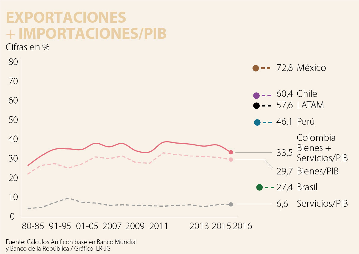 Mas aún, el comercio intra-bloque de la AP ha venido en declive (bordeando actualmente 4% del total comerciado con el mundo) y siempre ha sido inferior en su valor a lo que ocurre con el Mercosur del Brasil-Argentina-Paraguay-Uruguay (con cerca de 16%). El cuadro adjunto señala, además, la posición desfavorable que tiene Colombia frente a sus pares regionales en cuanto a grado de apertura de la economía (exportaciones+importaciones/PIB).