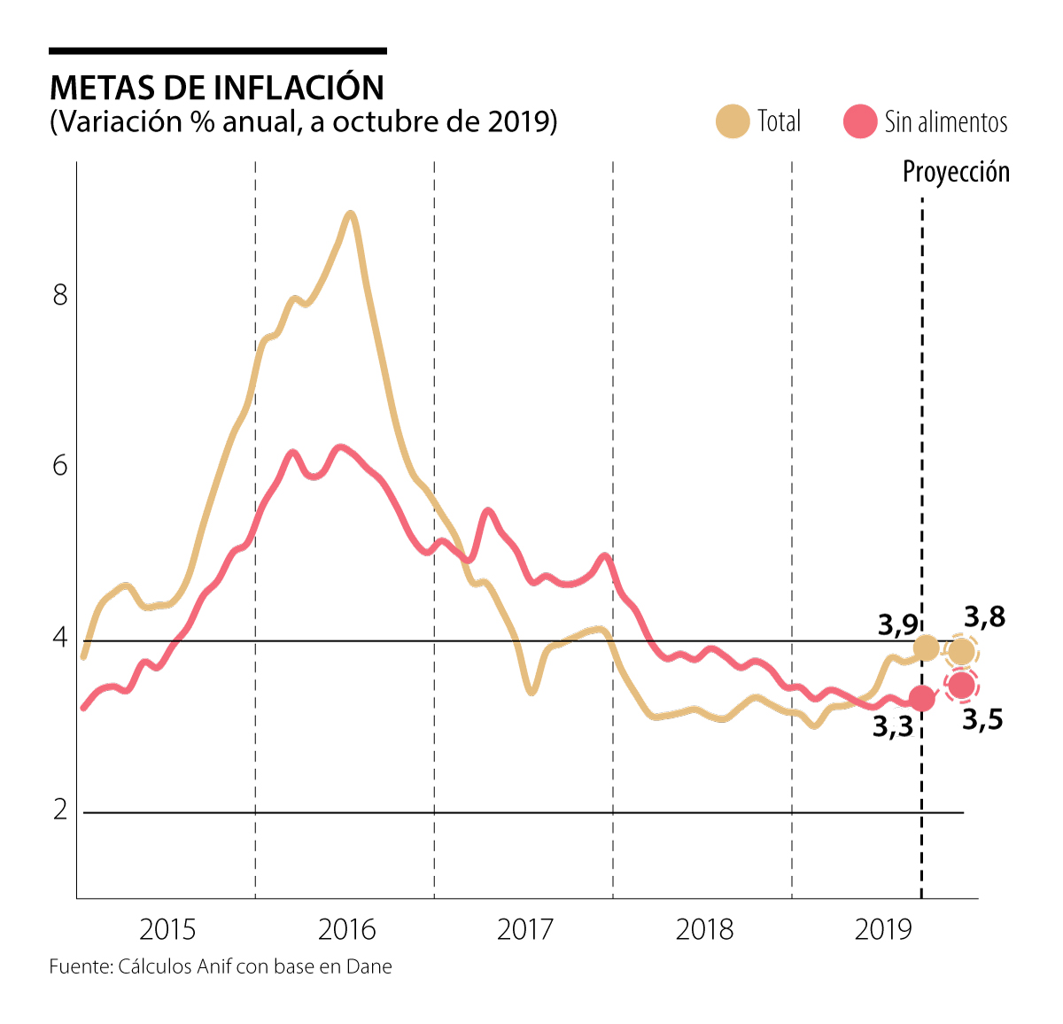La inflación subyacente (sin alimentos) se mantuvo inalterada en niveles del 3,3% anual. Allí las presiones provenientes de los mayores costos de los importados (con una devaluación promedio del 12% anual entre enero-octubre) han empezado a transmitirse a los precios por cuenta de una demanda agregada más sostenida. Por ejemplo, el Indicador de Seguimiento a la Economía (ISE) del Dane registró una expansión del 3,5% anual en julio-agosto de 2019 (frente al promedio del 3% observado en enero-junio).
