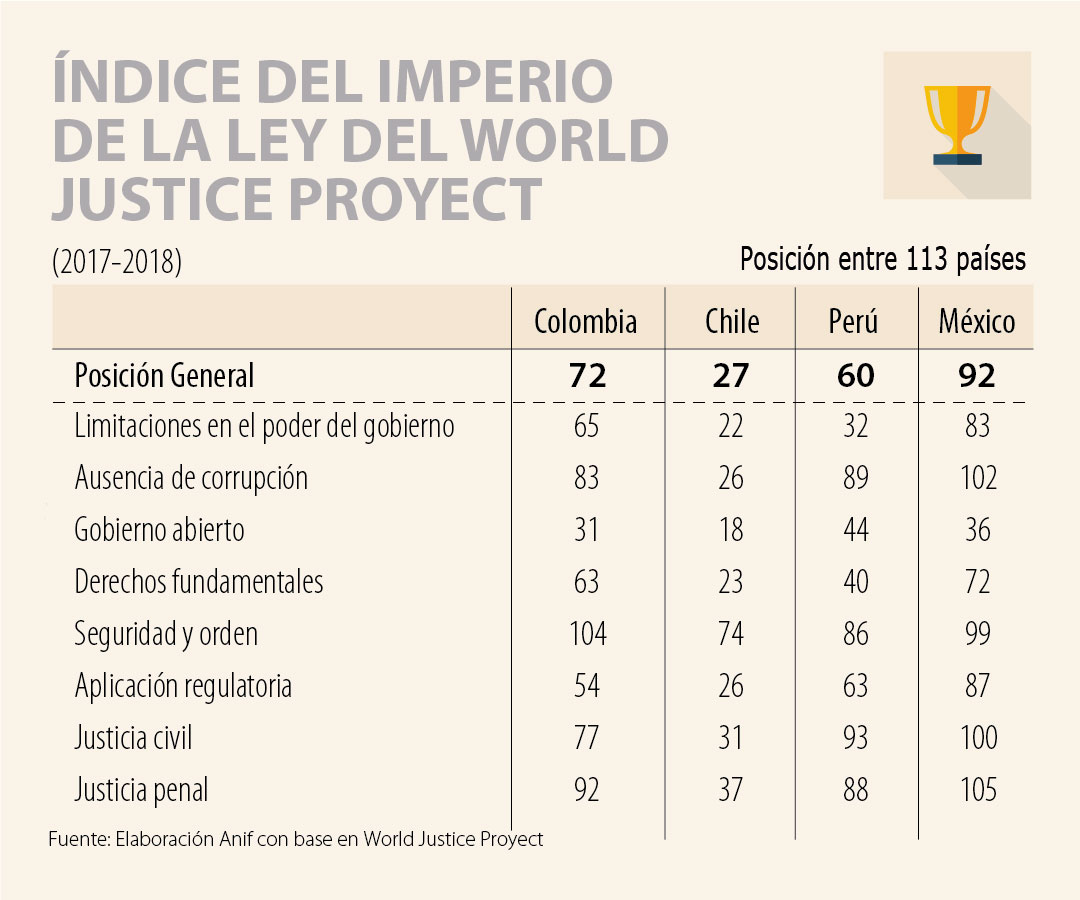 El reporte más reciente sobre “Imperio de la Ley” (World Justice Proyect) informa que Colombia se ubicó en el puesto 72 entre 113 países del ranking mundial. Esto implicó un deterioro de un puesto en dicho ranking, donde continuamos muy rezagados en materia de aplicación de la justicia respecto de, por ejemplo, Chile (27) y Perú (60). Tan solo superamos entre los referentes regionales a México (92).