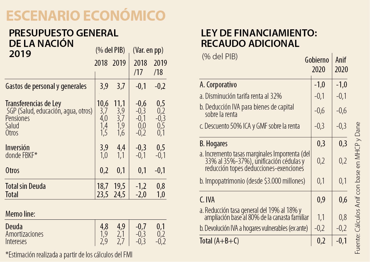 Para abrir espacio a todo este gasto, el MHCP tuvo que recurrir a realizar operaciones de canje de deuda y así postergar amortizaciones por valor de $14,5 billones, lo cual implica incrementar la deuda en casi 1,5% del PIB frente al MFMP-2018. Esta cifra coincide con el mayor gasto público arriba reportado, el cual seguramente se estará financiando con mayores transferencias de utilidades desde Ecopetrol (alcanzando seguramente un 0,6% del PIB) y con el mayor recaudo esperado de la Ley de Financiamiento que acaba de radicarse ante el Congreso. El grave problema es que la relación Recaudo/PIB viene tan baja como un 13,5% para 2019, cayendo desde los niveles de 14,5% del PIB de los buenos años de 2014-2015, a pesar de los logros de la Ley 1819 de 2016 en materia de IVA, tras elevar la tasa general del 16% al 19%.