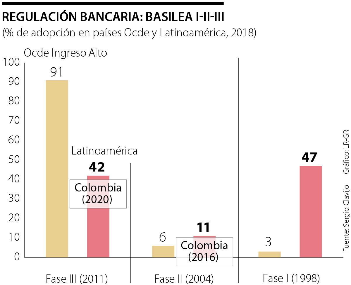 En el caso de la banca operando en Colombia, se tenía que esta formaba parte de ese 11% que, al finalizar 2016, todavía permanecía en Basilea II (ver gráfico adjunto). Sin embargo, durante 2017-2020 se han dado avances importantes y se considera que, para finales de 2020, Colombia ya formaba parte de ese 42% que en América Latina se había acoplado a Basilea III (con las transiciones pendientes del periodo 2021-2024).