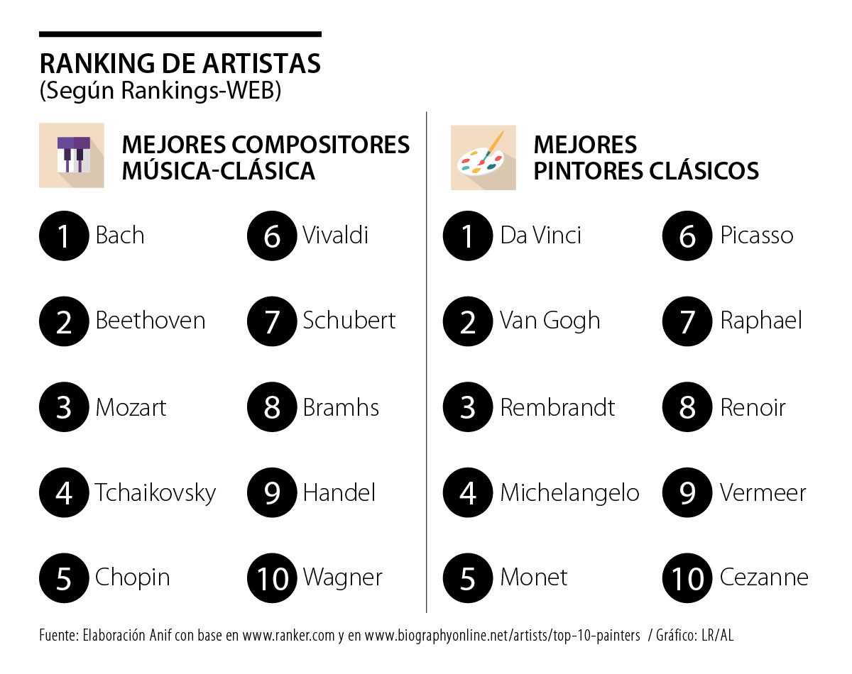 Decíamos que una forma fácil de obtener un ranking de mejores compositores de música clásica era a través de la WEB, por ejemplo, en https://www.ranker.com/crowdranked-list/my-favorite-classical-composers-of-all-time. También existe la alternativa de recurrir a los rankings de expertos, como el conocido crítico musical Tommasini (The New York Times). Los resultados así obtenidos destacan en los primeros lugares a Bach, Beethoven y Mozart (aunque en la mayoría de los listados la preeminencia suele dársele a Beethoven).