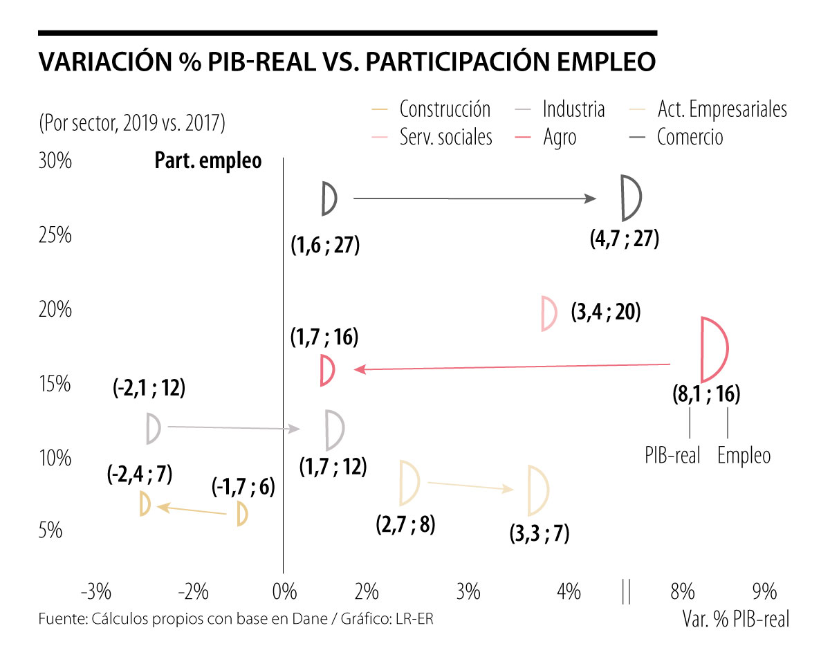 Así, no basta con afirmar que simplemente se requiere acelerar el crecimiento potencial para bajar el desempleo y diversificar las exportaciones (esa es una afirmación de Perogrullo). Lo que es menester es montar análisis sectoriales sobre la dupla crecimiento-absorción mano de obra a nivel de país. En el caso de Colombia, se tienen evidentes dificultades con el agro y la industria (ver gráfico adjunto). En cambio, el sector de servicios (especialmente los de salud) y de comercio-turismo habían mostrado mejores perspectivas, pero en pos-pandemia este último se verá afectado, igualmente que el de la construcción (que ya venía mal).