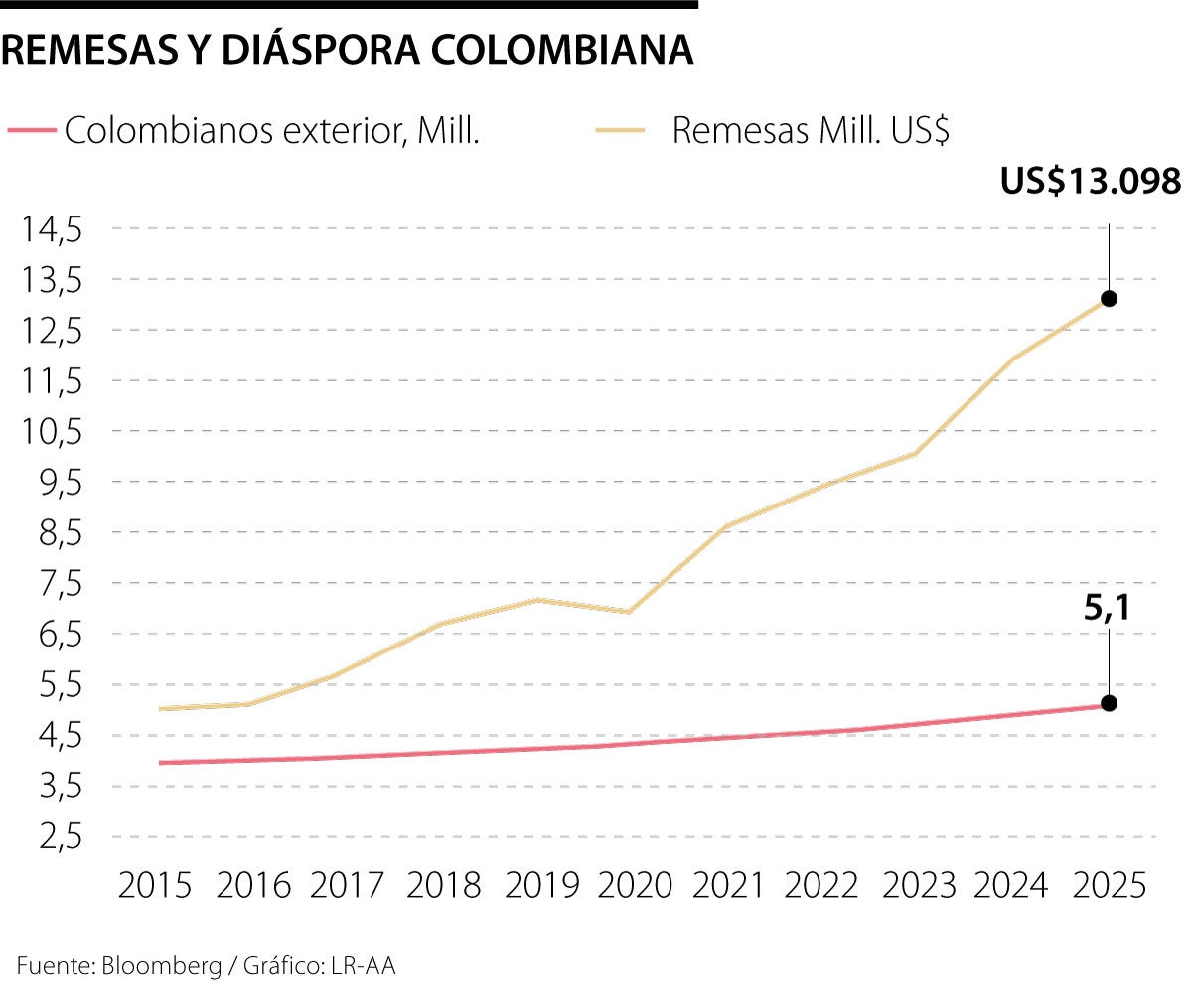 El gráfico adjunto ilustra cómo, mientras la diáspora que envía remesas ha venido creciendo a 3% anual durante 2015-2025, pasando de 3,8 a 5,1 millones de colombianos, el monto de remesas ha crecido a la increíble tasa compuesta de 10% anual. Si el grueso de dichos envíos realmente correspondiese a la porción de ingresos salariales que se envían para ayudar en el soporte familiar, esto implicaría que los reajustes salariales (en dólares o en euros) habrían sido en el exterior de 7% anual (equivalente a reajustes reales de 3% por año).