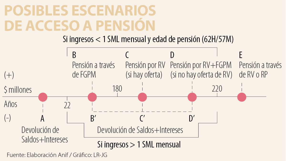Si se cumplieran los requisitos de 22 años de cotización y la edad de 57/62 Mujer/Hombre, pero los montos ahorrados todavía fueran inferiores a los $180 millones, cabe la posibilidad de halar recursos complementarios del Fgpm para intentar comprar una RV (caso B). En la práctica lo que ha ocurrido es que se aduce que ese monto (en realidad) debería superar los $180 millones y acercarse, digamos, a unos $220 millones para irse por la alternativa de “un retiro programado” (RP). Esto ocurre ante la ausencia de “oferta” de RV por parte del sector asegurador privado debido a incertidumbres de tipo legal y financiero (caso D).