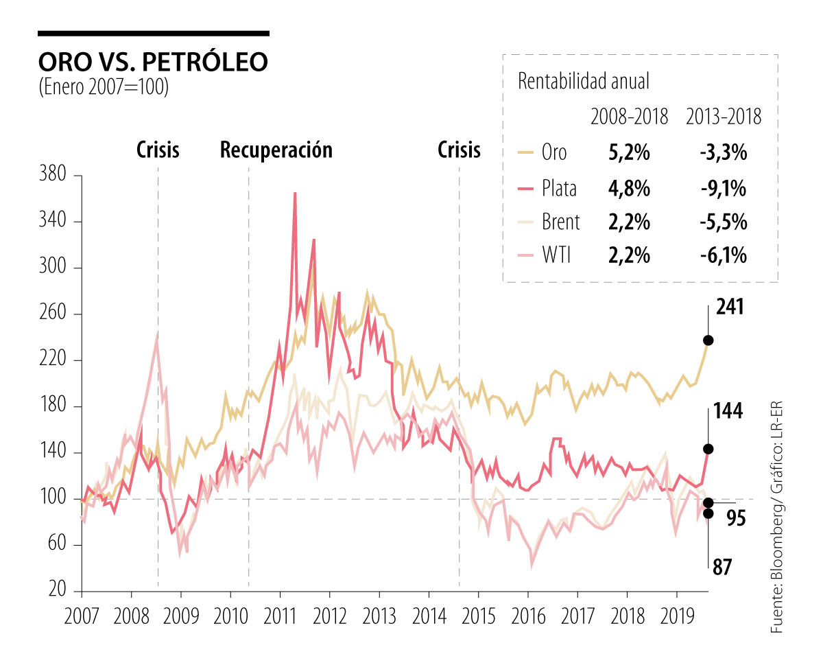 Pero en la fase de recuperación global (2013-2018), el oro perdió buena parte de su atractivo y, de hecho, su retorno viró hacia el plano negativo, promediando pérdidas de -3% anual. Solo en la segunda mitad de 2019 el oro inició un nuevo rally de valorización (como el antes señalado). Esto debido a la inminente desaceleración global resultante de la guerra comercial entre Estados Unidos y China.