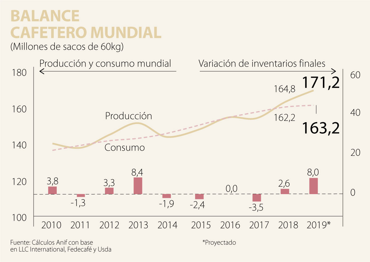 Ello obedeció a un crecimiento en la producción de Brasil (principal productor mundial), la cual llegó a 57.7 millones de sacos (12%% anual), pese a que 2017-2018 correspondió al año valle de su ciclo bienal.