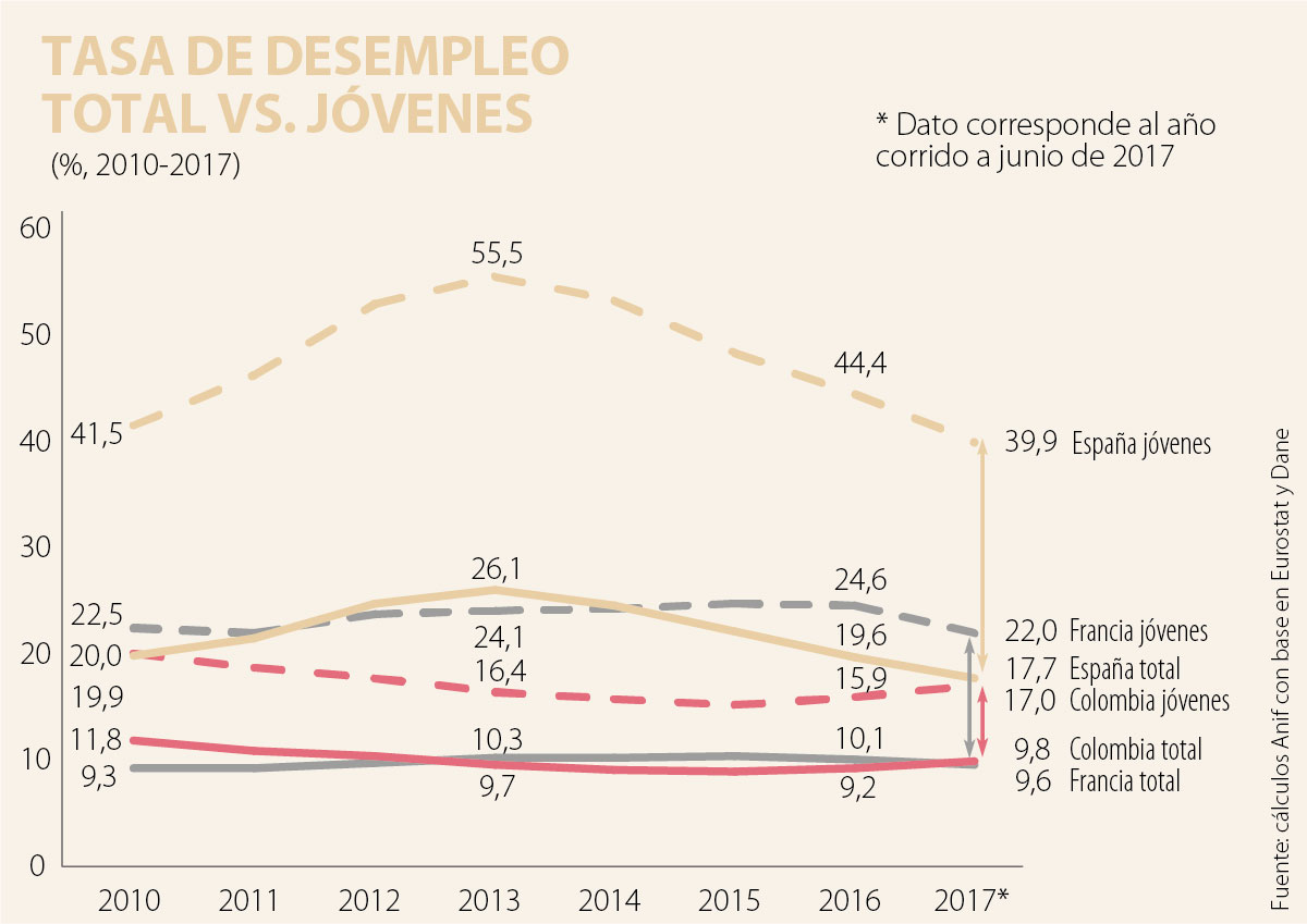 Los jóvenes a nivel internacional enfrentan desafíos laborales crecientes. En ello juegan diversos factores. En primer lugar, esos jóvenes presentan la Tasa Global de Participación (TGP) más baja de la población. Por ejemplo, en Colombia esa TGP es de 57,7% en jóvenes y de 64,3% en la población total. Y, sin embargo, ellos son los que sufren la mayor tasa de desempleo, usualmente casi que duplicando la del total en los países desarrollados, probablemente por su menor “entrenamiento” y los elevados costos de enganche. Esto es particularmente angustiante en los mercados laborales “sobreprotegidos” de Europa: en España los jóvenes enfrentan actualmente tasas de desempleo del 39,9% vs. 17,7% de tasa general; en Francia es del 22% vs. 9,6% de tasa general. En el caso de Colombia, la tasa de desempleo en jóvenes está menos “castigada” que en Europa, pero aún así el desempleo juvenil ha venido promediando 17% (en lo corrido de 2017) vs. 9,8% observado en el total del mercado laboral del país.
