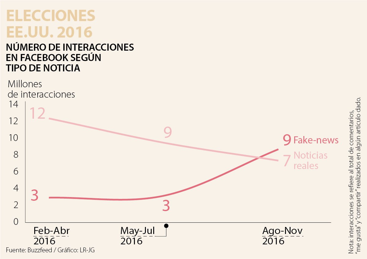 Así las cosas, lo que ha cambiado en años recientes es la velocidad de diseminación , como consecuencia de: i) menores barreras y costos para la publicación; ii) la ausencia de un marco regulatorio que limite-controle los contenidos originales, y iii) la mayor penetración de las redes sociales, siendo este el medio que más facilita-impulsa la diseminación. Todo lo anterior ha incentivando la aceleración de dicho fenómeno, donde las fake-news llegaron incluso a recibir más interacciones que las noticias verdaderas en los tres meses previos a las elecciones presidenciales de EE.UU. de 2016 (ver gráfico).