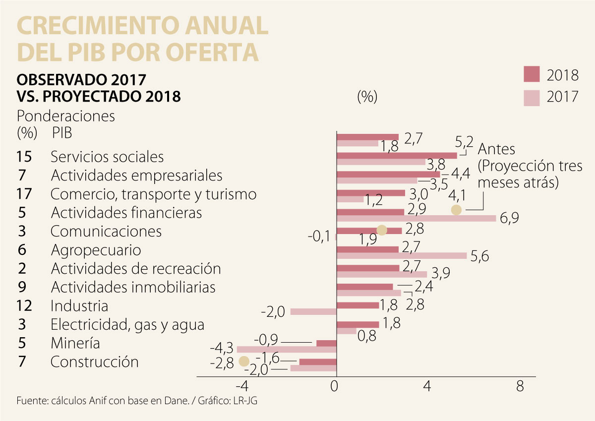 Las principales sorpresas negativas del tercer trimestre provinieron de: i) agro (0,1% observado vs. 2,9% proyectado), donde los cultivos agrícolas resultaron afectados por la caída de la producción cafetera, por los excesos de lluvias; ii) actividades financieras (1,7% observado vs. 4,5% proyectado), por la desaceleración de la cartera crediticia; y iii) minería (1% observado vs. 1,7% proyectado), por la pobre expansión en hidrocarburos y la marcada contracción del carbón.
