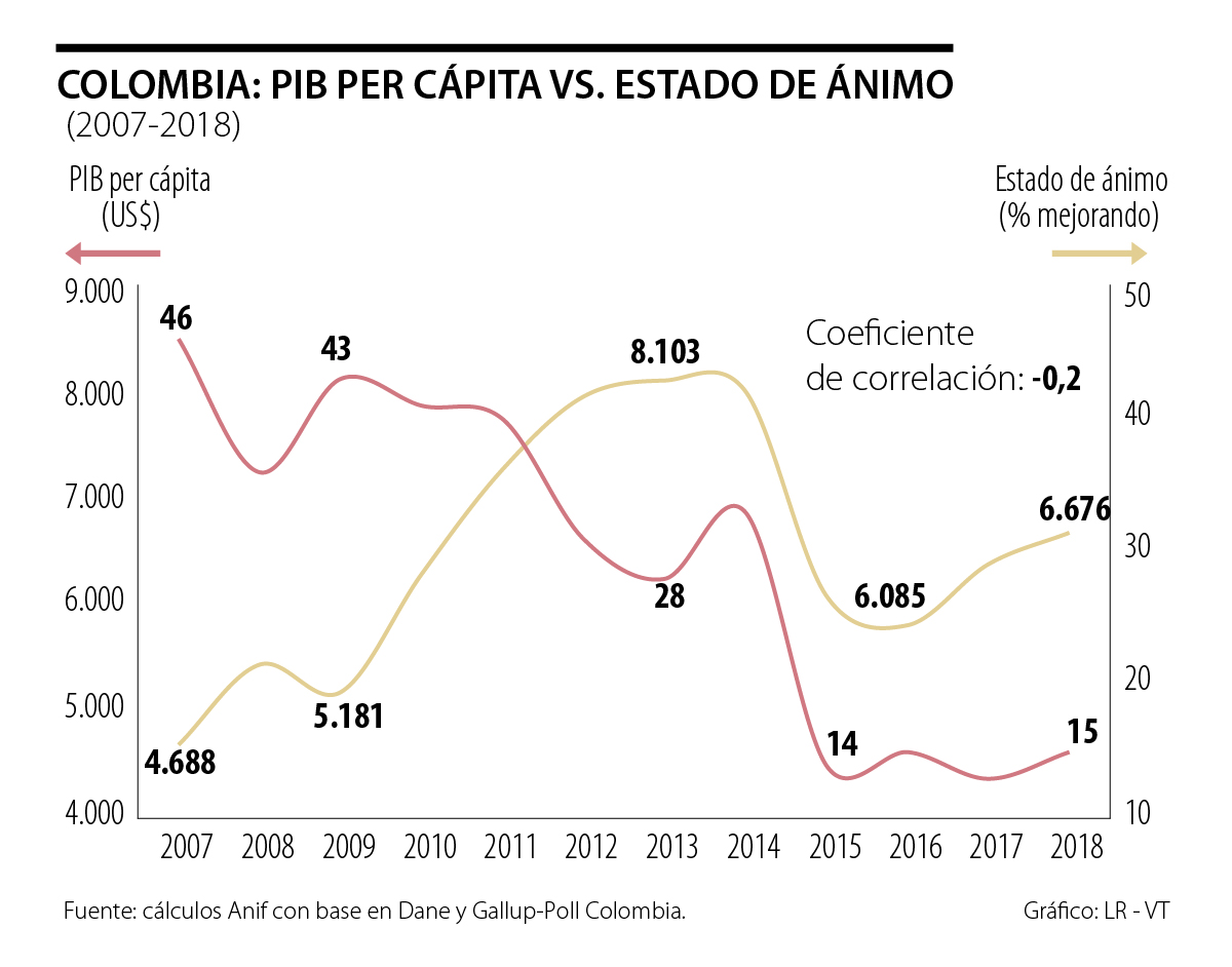Colombia, pese a los innegables progresos sociales arriba señalados, no ha sido ajena a esta dinámica de bajo reconocimiento de dichos avances. Por ejemplo, los resultados de la Gallup Poll evidencian que, desde 2008, el estado de ánimo de los ciudadanos viene deteriorándose (solo 15% de los encuestados opinaba que las cosas estaban mejorando en 2018 vs. 71% una década atrás). Posiblemente, se trate de un “malestar relativo” por cuenta de la mayor conocentración del ingreso (todavía con Ginis de 0,51) y de la riqueza (con Ginis cercanos a 0,70).