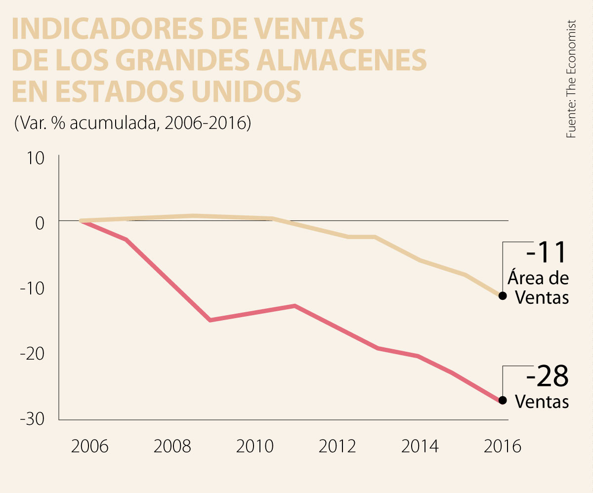 Los grandes perdedores han sido los almacenes-ancla con alta tradición de preferencia física en los centros comerciales. Por ejemplo, se estima que los almacenes de cadena han registrado contracciones de 10% en sus ventas en los últimos tres años, especialmente Macy’s, JC-Penneys y Sears.