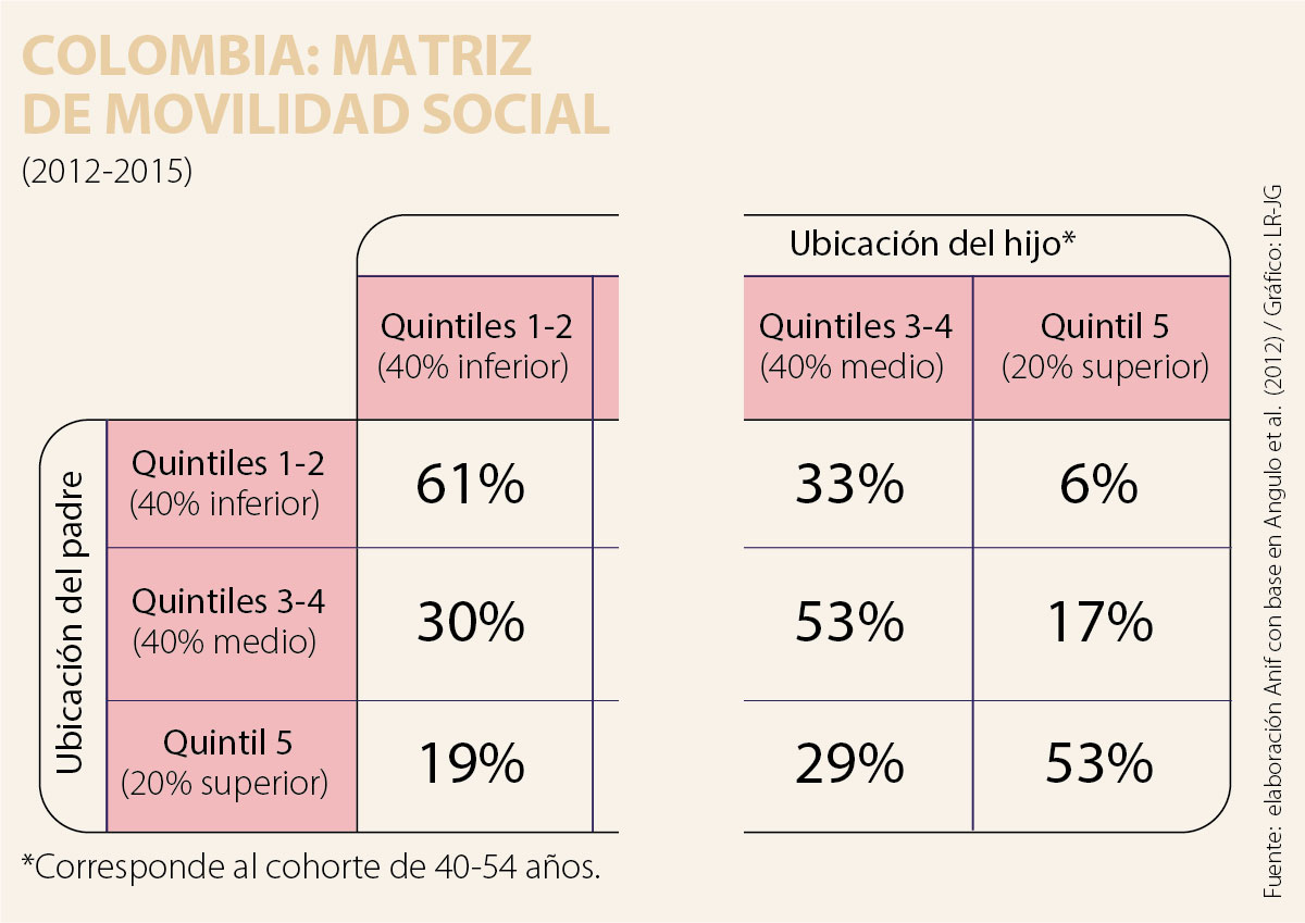 Ante esta disyuntiva, cabe preguntarse: ¿qué ocurría con la medición del Gini si se ajustara por las recientes ganancias en pobreza absoluta y por mejoras en la movilidad social de los estratos más bajos? Para responder a esta pregunta, Anif ha estimado un “Gini ponderado” para Colombia basado en: i) la distribución de los ingresos salariales de acuerdo con el Pila, donde es bien sabido que el salario medio del sector formal ha ido convergiendo hacia un salario medio de 1,4 SML; y ii) la matriz de transición, la cual indica la probabilidad de trasladarse de un quintil a otro (ver Angulo et al., 2012). El cuadro adjunto ilustra cómo la probabilidad de ascender desde el nivel inferior (quintiles 1-2) hasta el superior (quintil 5) es tan solo de 6% en Colombia, mientras que la probabilidad de mantenerse en el mismo nivel es tan alta como 61%.