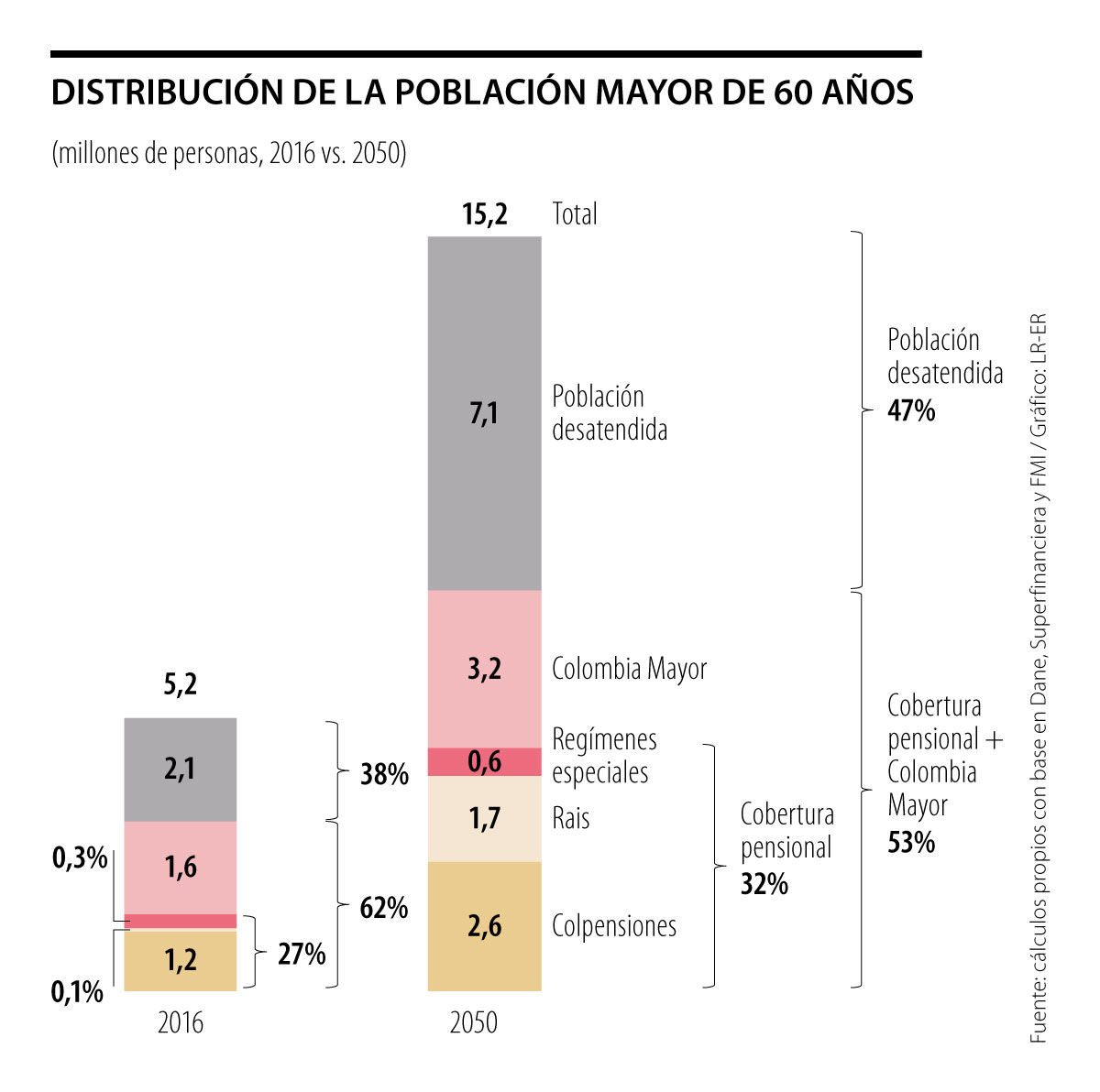 El remanente 35% que no recibe pensión depende del programa Estatal denominado “Colombia-Mayor”. Este tipo de programas de apoyos a ancianos sin pensión es una de las mejores herramientas Estatales para combatir la pobreza.