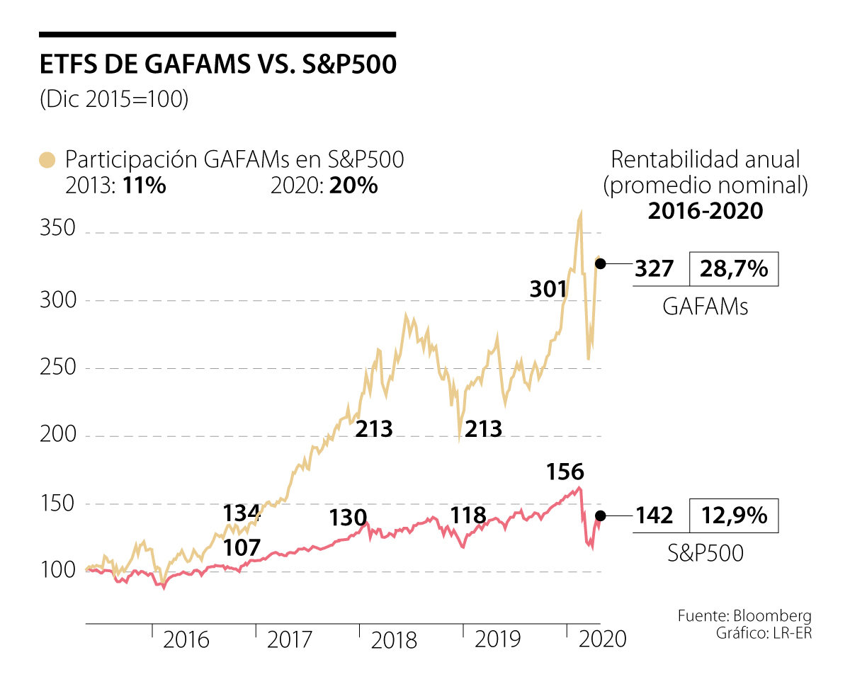 En el caso particular de la tecnología digital, allí se desnuda lo que en realidad hacen las llamadas GAFAMs (Google, Apple, Facebook, Amazon y Microsoft): aprovechar gigantescas bases de datos para explotar la comercialización a su favor. Mientras Google y Facebook coleccionan información gratuita de sus usuarios (quienes no pueden renunciar a compartirla), Amazon y Microsoft usan valiosa información para proveer bienes y servicios; todos explotan ese almacenamiento informativo a través de la inteligencia artificial. Apple es la excepción, pues es una “simple” boutique de telefonía celular. Pero sus innovativos desarrollos (especialmente entretenimiento) le han permitido posicionarse como la empresa de mayor tamaño con un RoE del 20% anual vs. el tradicional 10% de las empresas-estrella. La valorización bursátil de las GAFAMs ha sido de 30% anual en años recientes, duplicando la del S&P500 (ver gráfico adjunto).