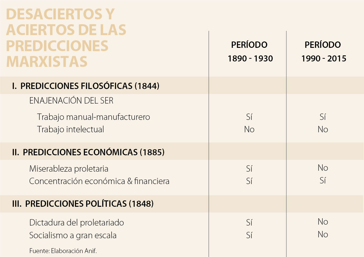 Con referencia a los supuestos legados del marxismo, en el cuadro adjunto postulamos que el balance ha sido mixto y cambiante en el tiempo. Por ejemplo, en materia del proceso productivo capitalista, no cabe duda que ello implicó cambios abruptos en lo que Marx (1844) denominó “la enajenación del ser” a través de asignarle a los obreros las tareas de producción de objetos en serie.