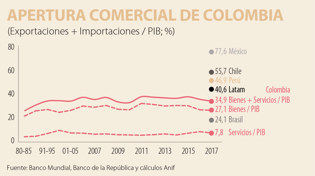 No en vano, Colombia era caracterizada como “el Nepal de Suramérica”, lo cual sigue siendo cierto si lo medimos por indicadores de apertura comercial (ver gráfico adjunto), donde el costo de fletes duplica el de países referentes, como Chile o Perú.