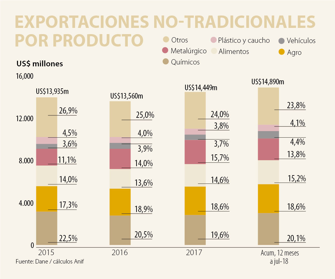 Si bien el valor exportado mostraba un crecimiento del 15% anual (en dólares) en el acumulado en 12 meses a julio de 2018 y su valor ascendía a los US$41.000 millones, ello obedece al repunte del petróleo al promediar US$72/barril Brent en lo corrido a septiembre de 2018 (vs. US$52/barril en 2017). Sin embargo, las exportaciones no-tradicionales tan solo crecían al 2,3% en este período y su valor no superaba los US$13.000 millones (30% del total), excluyendo metalúrgicos.