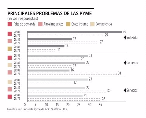 en 2017-I) y comercio (23% vs. 20%), ocupando el primer lugar en el ranking de preocupaciones. Esa falta de demanda fue algo menos grave en el sector servicios (21% vs. 28%), ocupando el tercer lugar de la lista de problemas