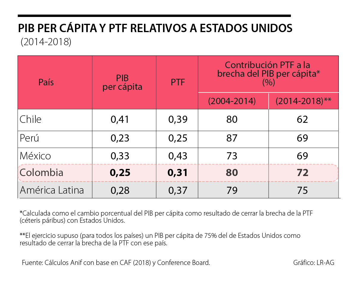 Estudios recientes de la CAF (2018) y del Banco Mundial (2018) estiman que la brecha del ingreso per cápita de Colombia respecto del de Estados Unidos se explica en 72% por la baja Productividad Total de los Factores (PTF) de Colombia. Lo sorprendente es que, tras una década desde el inicio de la llamada “Gran Recesión” (2008-2013), ahora se observa un estancamiento en la PTF del mundo desarrollado.