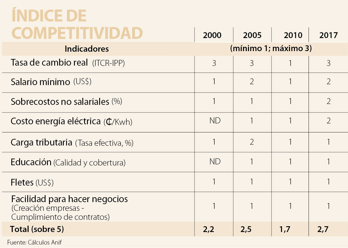Hemos visto cómo Colombia enfrenta una serie de problemas de competitividad derivados del elevado Costo Colombia. Así lo refleja el Índice de Competitividad (IC) que lanzó Anif a mediados de 2015. Recordemos que dicho IC mide la productividad-competitividad empresarial en las áreas de: i) tasa de cambio real frente a nuestros 22 principales socios comerciales; ii) sobrecostos en insumos empresariales, destacándose los laborales, de energía y de transporte; iii) calidad del capital humanoeducación; iv) carga tributaria empresarial; y v) aspectos institucionales sobre “facilidad para hacer negocios”. El IC se compone de ocho indicadores en los frentes mencionados, los cuales reciben una calificación de “bueno” (3), “regular” (2) o “malo” (1).
