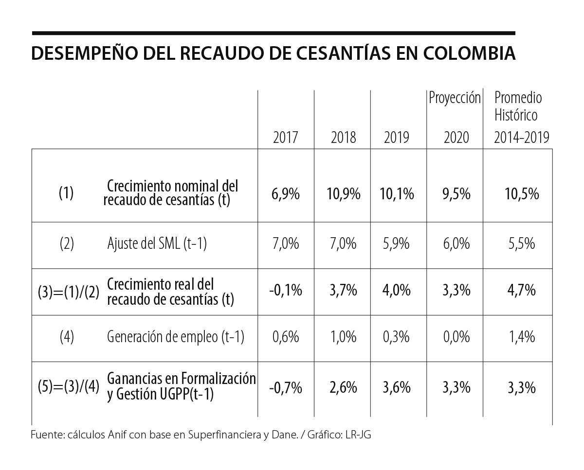 del recaudo de cesantías en 2020? Al respecto, Anif proyecta una desaceleración de dicho recaudo hacia tasas del 3,3% real anual (frente al 4%