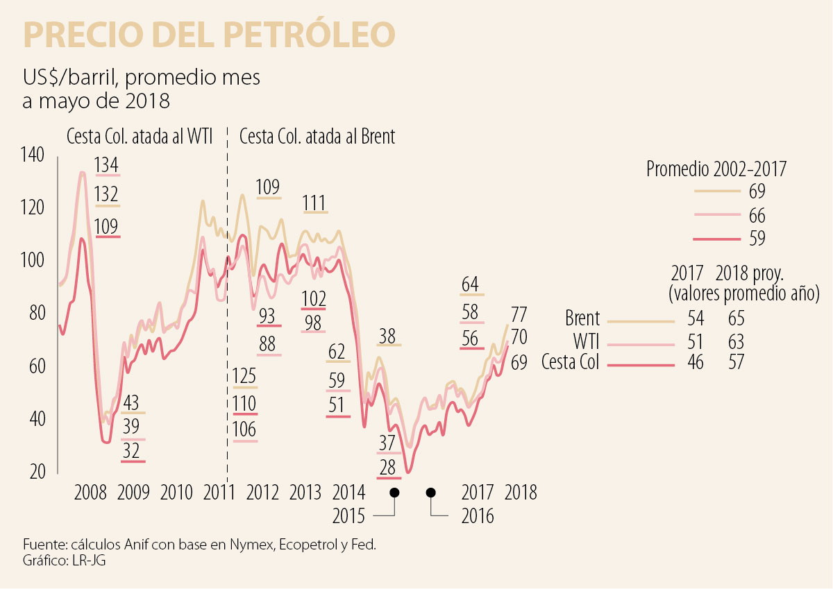 Ello se explica principalmente por: i) la menor oferta de la Opep (llegando a niveles mínimos de 32,1 Mbpd el pasado abril), por cuenta de la extensión del acuerdo hasta finales de 2018 (incluyendo a Rusia) y la menor producción de Venezuela (1,5 Mbpd vs. 2-2,5 Mbpd en 2016-2017); ii) las tensiones geopolíticas de Medio Oriente y la salida de EE.UU. del pacto nuclear con Irán, lo cual estaría disminuyendo las exportaciones de crudo de Irán de los actuales 2,5 Mbpd hacia 1-1,5 Mbpd; y iii) el repunte de la demanda global en 1,5 Mbpd en 2018, principalmente por cuenta de China e India (con crecimientos económicos de 7% anual).