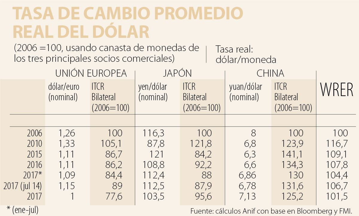 En la Zona Euro, los indicadores líderes sugieren potenciales rebotes hacia crecimientos de 2% en 2017. Allí ha resultado favorable: i) la disipación del riesgo político de resquebrajamiento de la Zona Euro; y ii) avances en la solución de los riesgos bancarios en Italia (incluyendo apoyos presupuestales) y de Alemania (recapitalizando sus bancos). Así, la relación dólar/euro, se observan promedios de US$1,09 en lo corrido de 2017 (una apreciación de 2%). Este guarismo ha ido a contrapelo de las expectativas que teníamos los analistas al inicio de este año (incluido Anif). Durante el segundo semestre esperaríamos ver el promedio año dólar/euro manteniendo ese US$1,09.