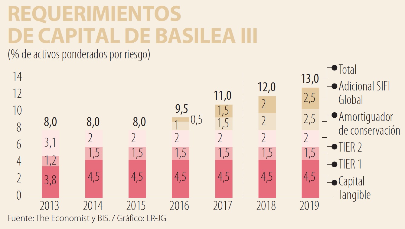 En particular se les pediría: i) colchones adicionales de capital cercanos al 2,5% en la relación de solvencia, llevando dicha relación potencialmente a niveles del 13% (en línea con Basilea III, ver gráfico adjunto); ii) pruebas de estrés bi-anuales en cabeza del Fed, pudiendo este último frenar los planes de pagos de dividendos a sus accionistas (incluyendo límites a la recompra de acciones); y iii) requerimientos de “actas de defunción” (living-wills) para así tener planeado el proceso de liquidación (en caso de riesgo de quiebra).