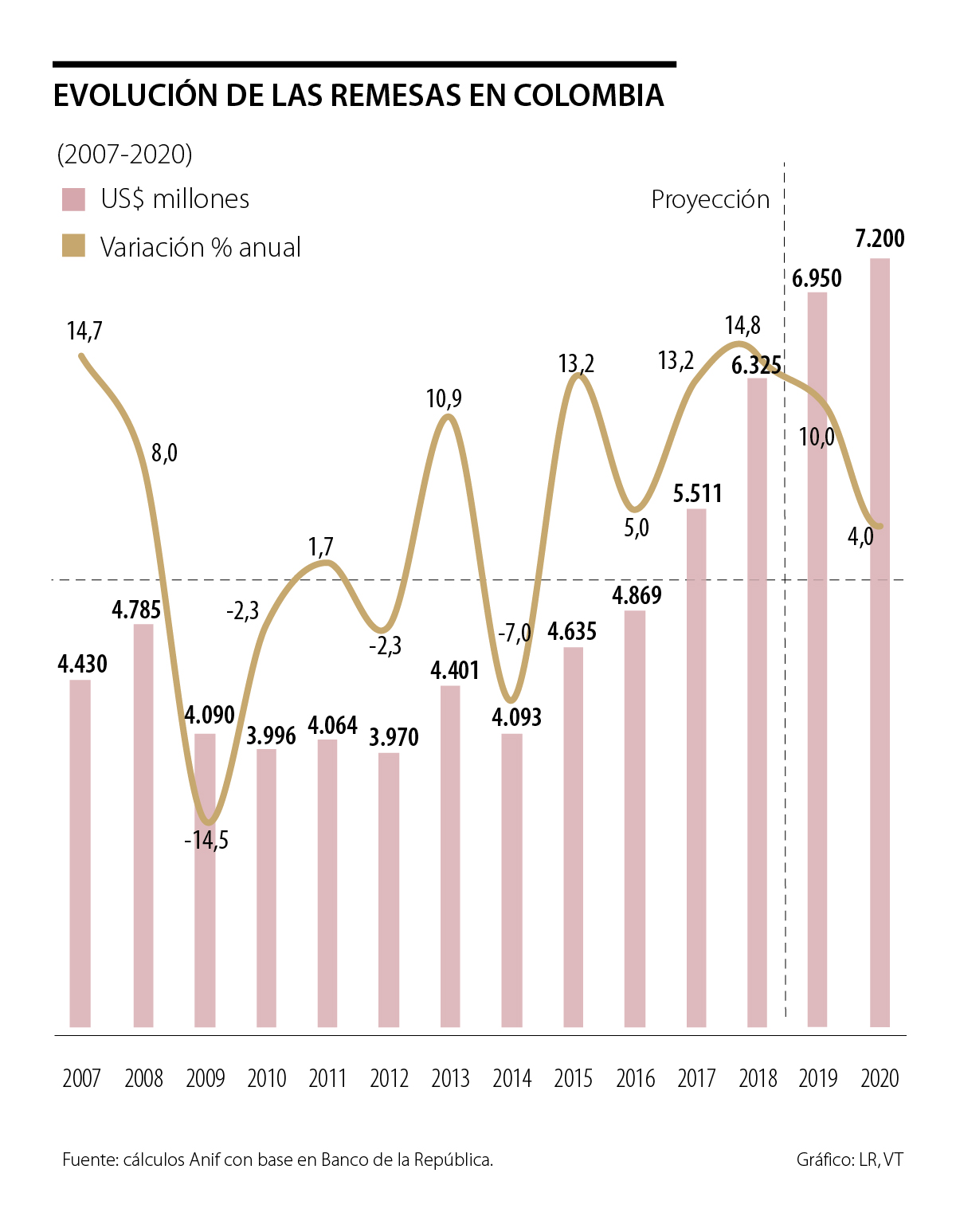 Es cierto que los flujos de remesas a países de bajo-mediano ingreso alcanzaron una cifra récord en 2018. Dichos flujos habrían alcanzado los US$529.000 millones en 2018, creciendo casi 10% frente al año inmediatamente anterior (ver World Bank, “Migration and Development Brief”). Colombia no ha sido ajeno a dicho auge en remesas, alcanzando niveles de US$6.300 millones en 2018 (expansión de 15%) y perfilándose hacia los US$7.200 millones en 2019-2020 (ver gráfico 1).