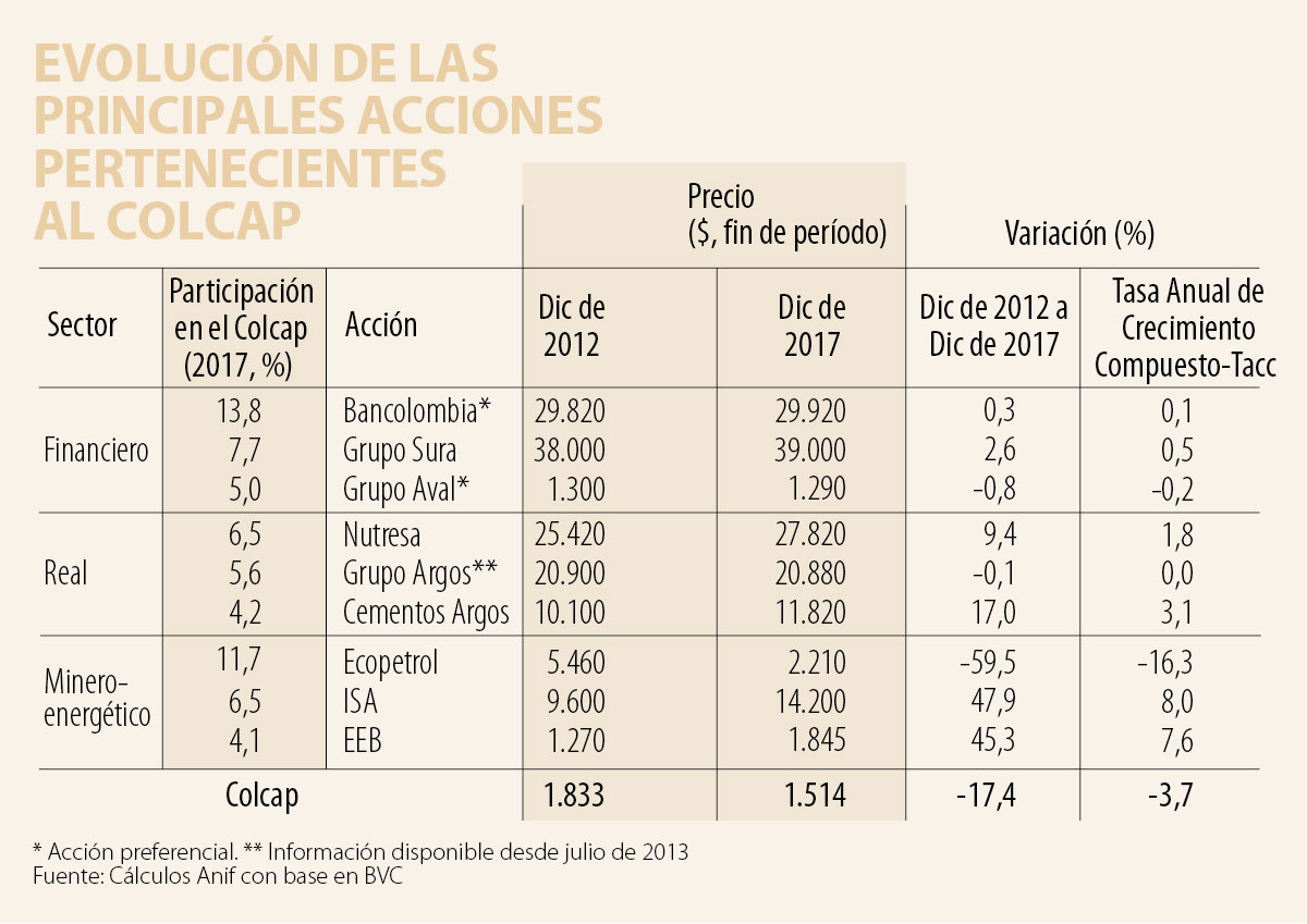• Sector minero-energético: entre 2012 y 2017, Ecopetrol perdió -59,5% de su valor (equivalente al -16,3% promedio anual).