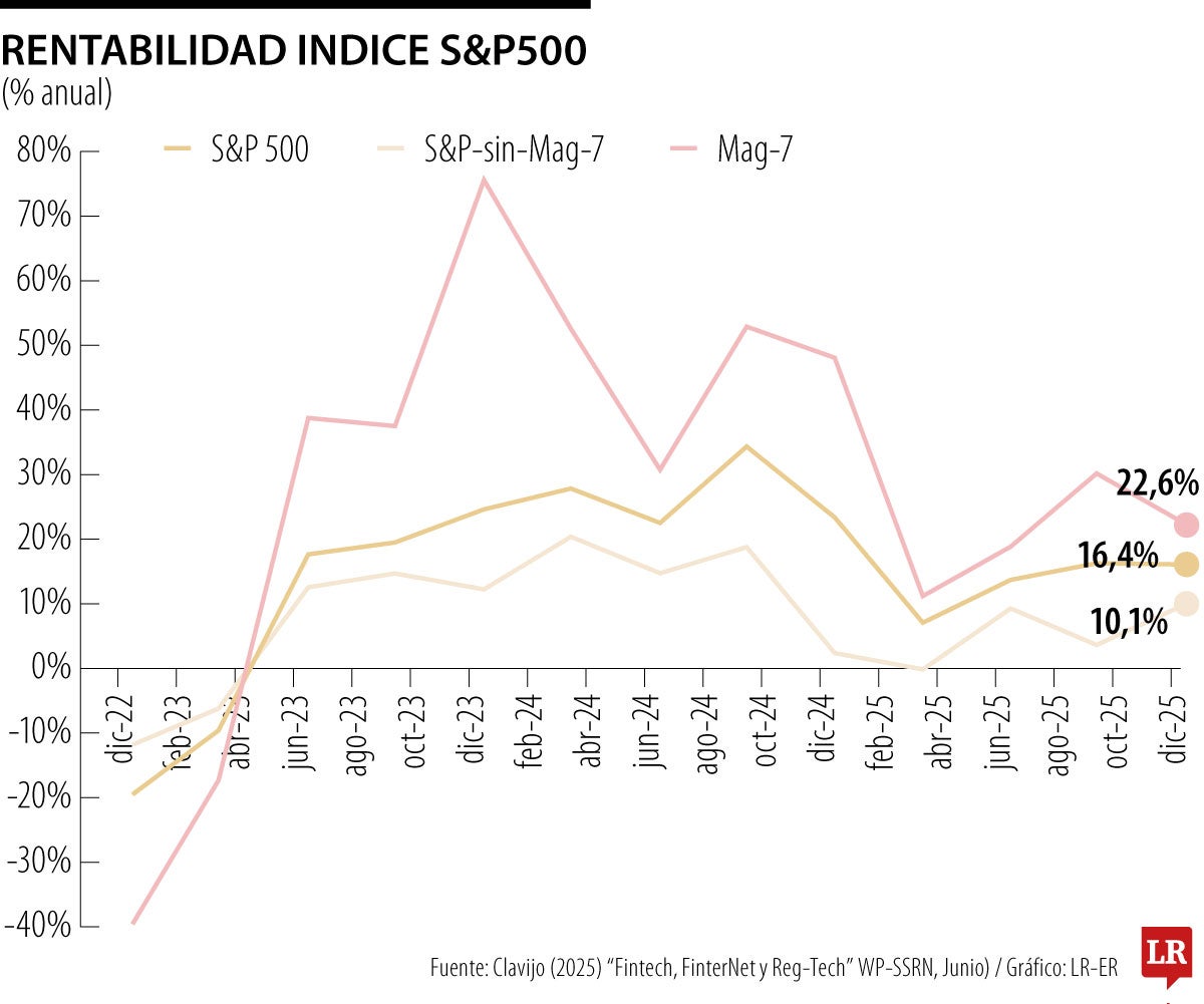 En particular, estas Magníficas 7 tuvieron rentabilidades de 23% anual en 2025 (en dólares), mientras que el resto del S&P 500 (no Magníficas 7) se valorizó 10% el año pasado. Y, durante el periodo 2023-2025, el liderazgo de las Magníficas 7 ha sido aún más evidente al registrar valorizaciones promedio de 47% anual, mientras que las no Magníficas 7 lo hicieron a ritmos de 8% anual, ver gráfico adjunto.