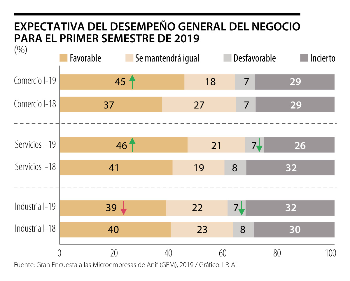 En materia de situación económica, los resultados de esta segunda lectura de la GEM reflejaron un deterioro en la percepción de los microempresarios de los tres macrosectores sobre el desempeño de su negocio: comercio (-7% en 2018-II vs. -3% en 2017-II), servicios (-2% vs. +7%) e industria (-1% vs. +2%). Esto evidencia algo de rezago en la transmisión de la moderada recuperación económica de Colombia al desempeño de las microempresas. En efecto, para el primer semestre de 2019, las expectativas de los microempresarios sobre la situación económica de sus negocios empezaron a reflejar un mayor optimismo, aumentando el balance de respuestas en los sectores de comercio (38% en 2019-I vs. 30% en 2018-I) y servicios (39% vs. 33%), y manteniéndose inalterado en industria (32%), ver gráfico adjunto. Esto es consistente con los pronósticos de moderado rebote económico para este año, donde (por el momento) Anif proyecta crecimientos del PIB-real del 3,3% (vs. 2,7% en 2018), aunque expresamos nuestro sesgo bajista por cuenta de factores relacionados con la guerra comercial internacional, la baja en los precios del petróleo y las complicaciones de nuestro mercado laboral .