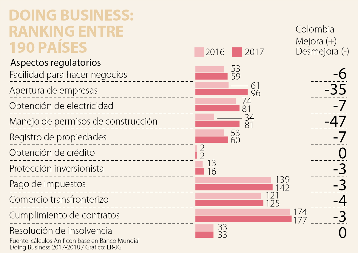 En síntesis, el informe Doing Business 2017-2018 mostró que el país retrocedió en su posición en el escalafón de facilidad para hacer negocios, cayendo del lugar 53 en 2016 al 59 en 2017, entre 190 países. De hecho, la evaluación desagregada del último año resultó bastante negativa, en la medida en que 8 de las 10 áreas regulatorias presentaron deterioros. Los casos de cumplimiento de contratos, pago de impuestos y comercio transfronterizo fueron los más críticos del reporte, donde la posición relativa continúa siendo de gran rezago, aún frente a nuestros pares de la Alianza del Pacífico. En estos campos es donde deberían concentrarse los esfuerzos de política pública de los próximos años. Ojalá que la eventual vinculación a la Ocde nos sirva para dejar de repetir diagnósticos y se cree una gran fuerza de choque (task-force) para actuar en la solución de estos conocidos problemas.