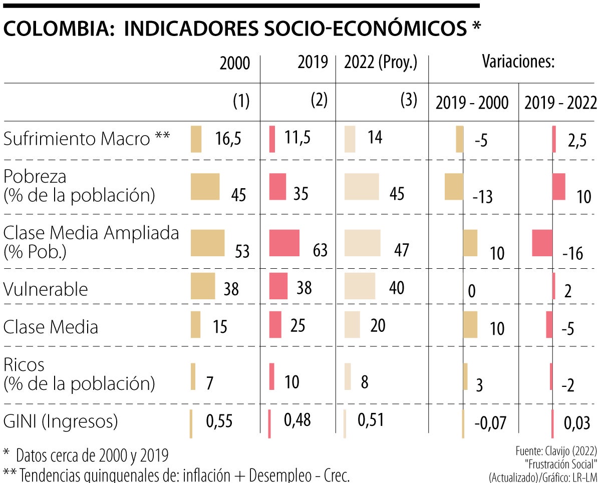 Ascenso de la clase media ampliada. Esta había llegado a representar 63% de la población en 2019 (incluyendo allí la porción vulnerable de 38%). La clase media propiamente dicha se había elevado de 15% a 25% durante 2000-2019, pero seguramente caerá hacia el 20% durante 2022-2024. Esto implica que, en su versión ampliada, la clase media caerá del 63% hacia 47%. Contener este descenso es uno de los retos más grandes que tendrá la Administración Petro durante 2022-2026.