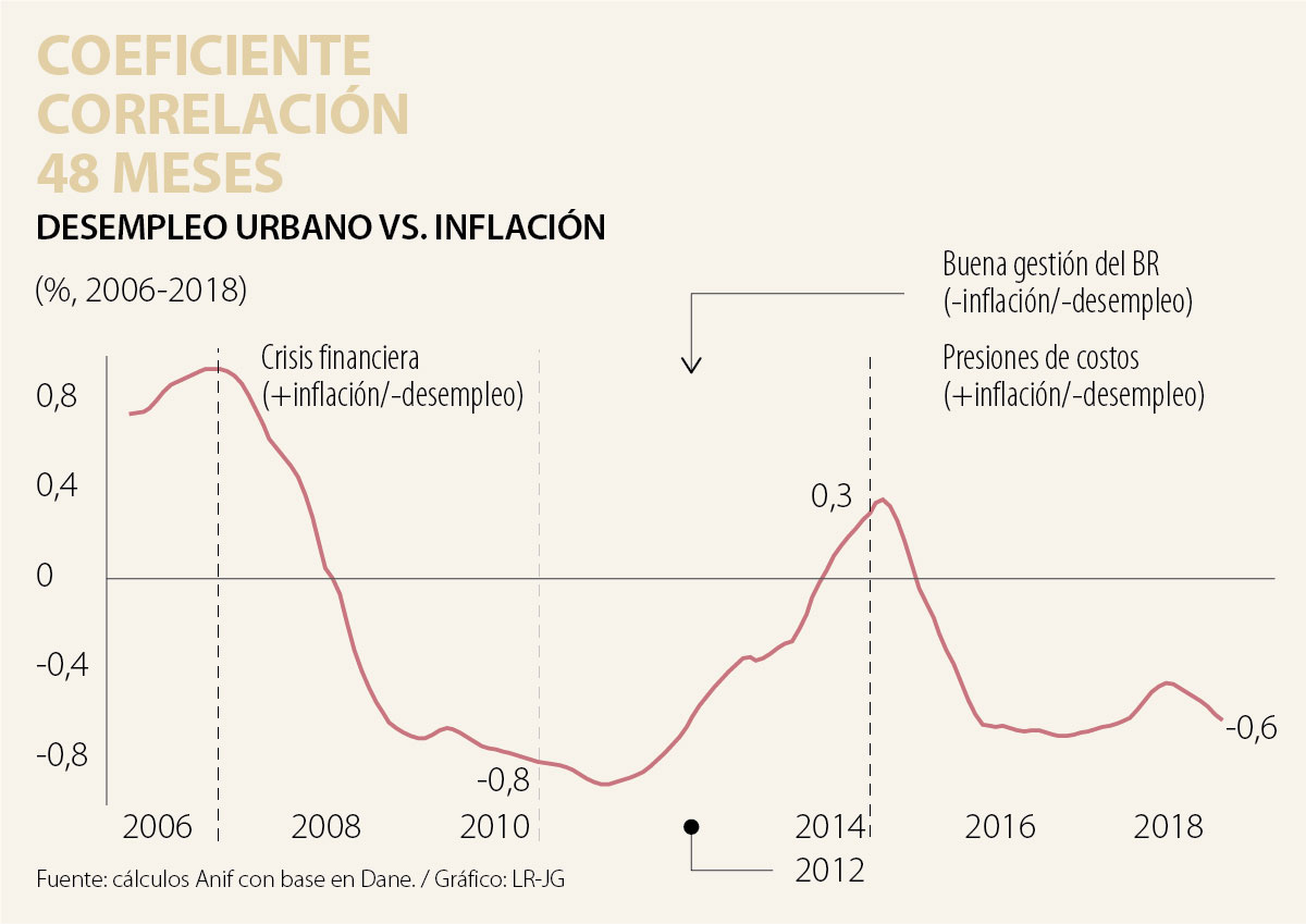 La destorcida minero-energética llevó a deterioros en el desempleo, pero también en inflación. Allí, el sistema de flotación cambiaria puso a prueba la inflación baja, pues se generaron significativas presiones de costos por el pass-through cambiario. A ello se sumaron los efectos de El Niño y el paro transportador.