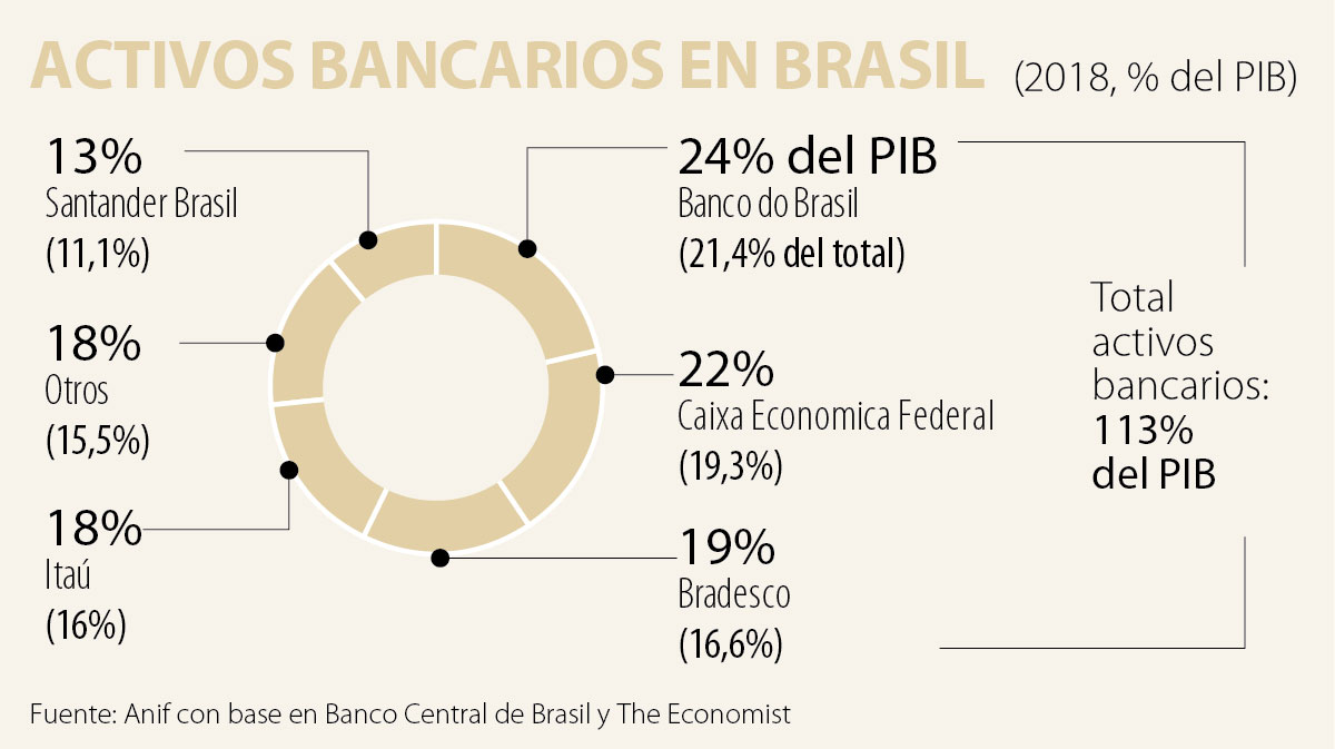 En esto último ayudaron las fusiones-adquisiciones del programa estatal PROER-PROES. El marco regulatorio, sin embargo, ha tenido que estar en guardia con las posiciones oligopólicas. Es evidente la mayor concentración del sistema tras la salida del Citi (vendiendo su participación a Itaú) y del HSBC (adquirida por Bradesco). Esto ha implicado que los tres principales jugadores privados (Itaú, Bradesco y Santander) y los tres públicos (Banco de Brasil, Caixa Económica Federal y Bndes) explican cerca del 85% de activos del sistema bancario del Brasil, ver gráfico adjunto.