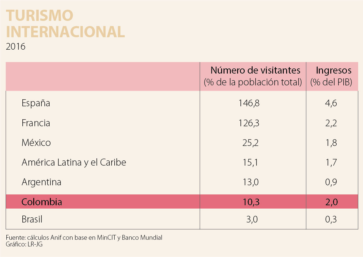 Pese a que todo ello luce favorable coyunturalmente, todavía hay desafíos estructurales que limitan su papel como sustituto de las exportaciones no tradicionales del país. En efecto, el número de visitantes que recibió Colombia tan solo representó un 10,3% de la población total en 2016. Al hacer una comparación internacional con referentes regionales o grandes jugadores internacionales, dicha cifra se queda pequeña. En efecto, al compararnos con México (25,2% de su población en 2016), Francia (126,3%) o España (146,8%) la perspectiva no es tan alentadora. Incluso, al considerar la dificultad para distinguir entre los viajeros de negocios, por turismo o “de paso” en Colombia, el mencionado 10,3% podría estar sobredimensionado.