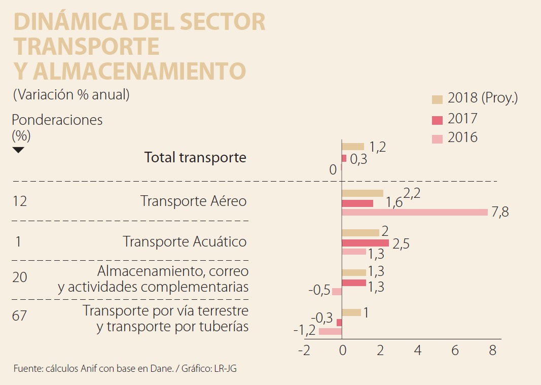 En particular, el transporte terrestre se recuperaría hacia crecimientos del 1% anual (vs. -0,3% en 2017) gracias al buen desempeño proyectado en sectores intensivos en carga terrestre como la industria (0,5% en 2018 vs. -2% en 2017), el sector minero-energético encabezado por carbón e hidrocarburos (+0,5% en 2018 vs. -4,3% en 2017) y el comercio (3,4% en 2018 vs. 1,3% en 2017). Por su parte, el transporte aéreo registraría una recuperación hacia el 2,2% (vs. 1,6% en 2017), que ya se evidencia en las cifras del primer trimestre (creciendo al 6,3% real vs. -0,2% de un año atrás), gracias al buen desempeño sectorial ya comentado, y al efecto estadístico a favor si no se presenta una situación de paro similar a la del cierre del año anterior.