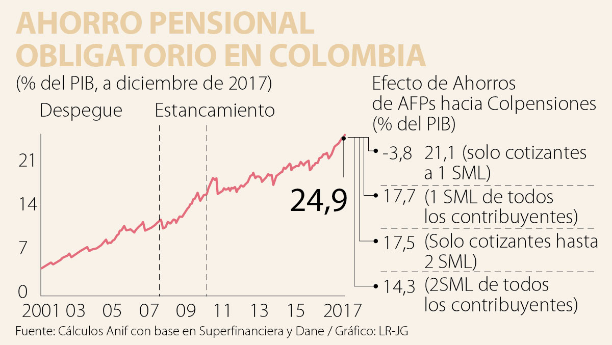 En efecto, diversos cálculos nos indican que en ese caso Colpensiones pasaría a manejar las cuentas del 80% de los contribuyentes a pensiones (unos 6 millones de personas adicionales), lo cual le dejaría una caja adicional de unos $8 billones / cada año (casi 0,8% del PIB). Si, además, Colpensiones le exigiera a las AFPs que le entregara el ahorro histórico de esos contribuyentes, se tendría un efecto stock (de una sola vez) por un valor hasta de 7,2% del PIB (si se exigiera el primer SML de todos los cotizantes a las AFPs). Más aún, si ese tipo de medidas de pilar básico se refiriera a la franja de los 2 SML, ese efecto stock de detrimento del ahorro privado de las AFPs se elevaría hasta un 10,6% del PIB.